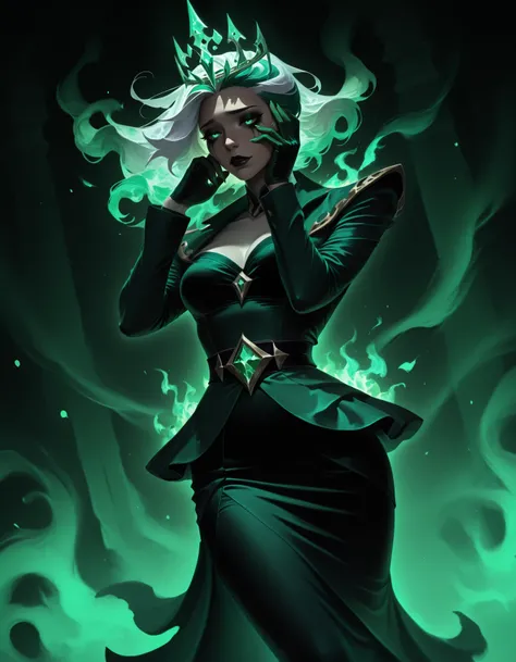 1girl, green hair, (circlet tiara), white hair, multicolored hair, green flames, ethereal, (painterly, traditional media \(artwork\)), dutch angle, pose, green theme, green fingernails, magic)runny makeup, sadofficial alternate costume