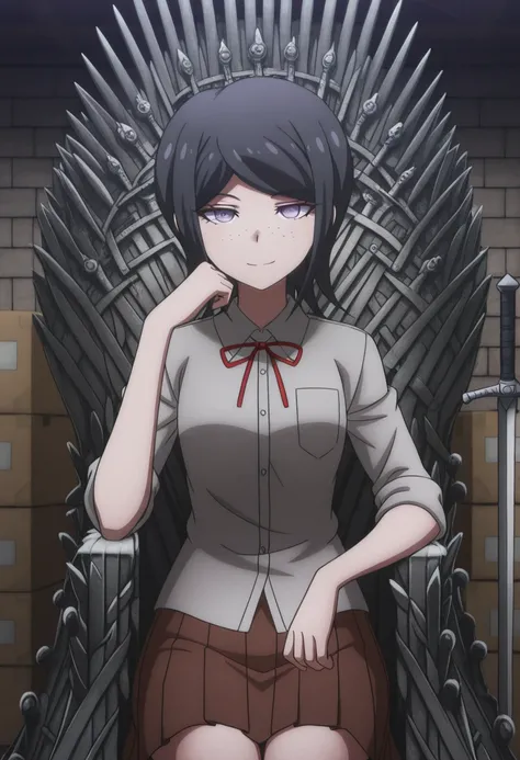 mukuro ikusaba, short hair, bangs, black hair, freckles, purple eyes, mature female, small breasts, anime screencapskirt, shirt, ribbon, white shirt, pleated skirt, collared shirt, red ribbon, neck ribbon, grey shirt, sleeves rolled up, brown skirt,