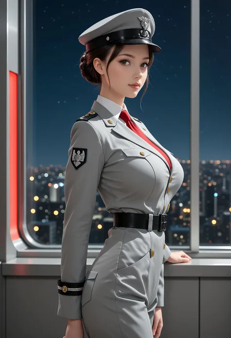 D025, (color) military uniform, tailored jacket with gold buttons, trousers with red strips, white shirt, red tie, black knee-high boots, officer's cap, black belt, badge, shoulder patches,