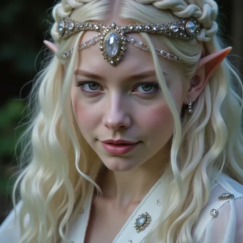 Galadriel, she-elf, long flowing golden-silver hair, grey eyes, youthful appearance
