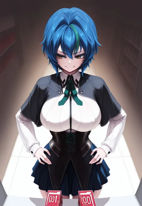 1girl, solo, yellow eyes, blue hair, green streaked hair, multicolored hair, short hair,