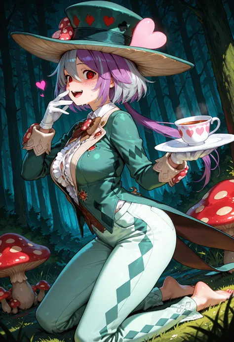 madhattermgepurple hair, grey hair, two-tone hair, long hair, ponytail, low ponytail, hair between eyes, red eyesgreen suit, green top hat, tailcoat, light green pants, white undershirt, brown bowtie, long sleeves, white gloves, black shoes, argyle, center frills, heart hat ornament, mushroomholding teacup, holding plate