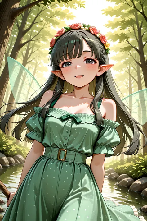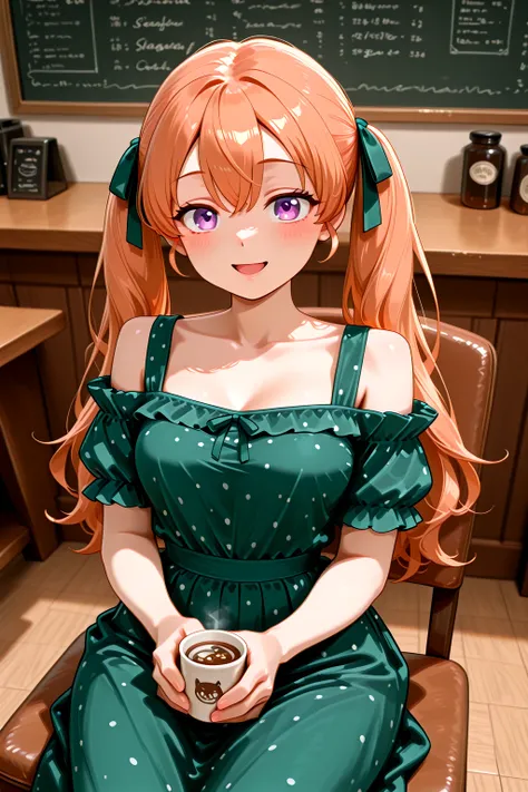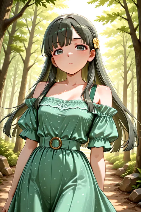 Emerald_Ruffle_OffShoulder_Polka_Maxi_Dress, green dress, off-shoulder dress, long dress, bare shoulders, puffy short sleeves, polka dot, collarbone, frillsgreen strap
