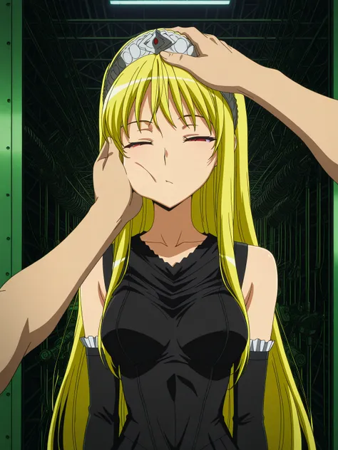 liliane, long hair, blonde hair, red eyes, very long hair, tiara, mature female, medium breasts, anime screencapgloves, dress, detached sleeves, elbow gloves, black dress, bare shoulders, sleeveless dress, collarbone, long skirt,