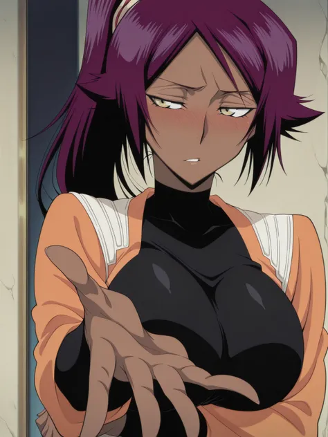 <lora:will-you-take-her-hand-illustriousxl-lora-nochekaiser:1>, will you take her hand, solo, blush, upper body, looking to the side, reaching, reaching towards viewer, arm under breasts, half-closed eyes, foreshortening, parted lips, nose blush, embarrassed,