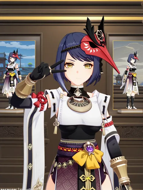 sara kujou, kujou sara, blue hair, short hair, swept bangs, yellow eyes, mature female, breasts, 3dbird mask, gloves, leotard, bracer, detached sleeves, elbow gloves, gloves, japanese clothes, jewelry, leotard, mask, mask on head, obi, pelvic curtain, pendant, sash, sleeveless, vision (genshin impact), wide sleeves,