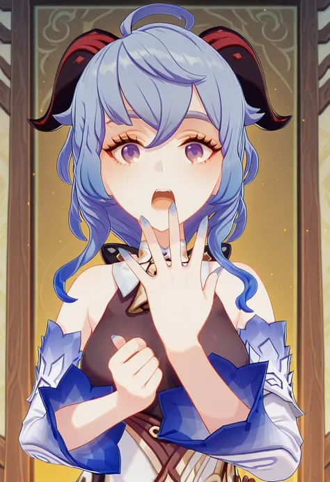 ganyu, ganyu (genshin impact), blue hair, goat horns, horns, long hair, purple eyes, sidelocks, mature female, medium breasts, 3d,gloves, bare shoulders, detached sleeves, black gloves, bell, bodysuit, neck bell, black bodysuit, vision (genshin impact), bodystocking, cowbell, chinese knot,