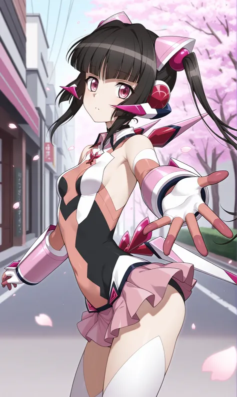 sidelocks, tsukuyomi shirabe, pink eyes, black hair, blunt bangs, twintails, hair ribbonheadgear, hair ornament, symphogear pendant, white thighhighs, leotard, covered navel, elbow gloves, pink bodysuit, black bodysuit, two-tone bodysuit, two-tone gloves, microskirt, pink skirt, detached sleeves, black choker, white detached collar