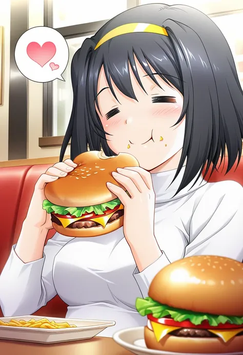 ak3h1me_m@yu, black hair, short hair, green eyes, yellow hairband