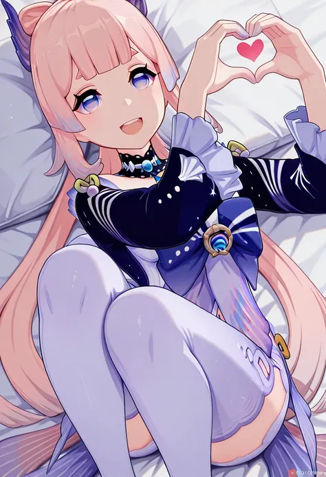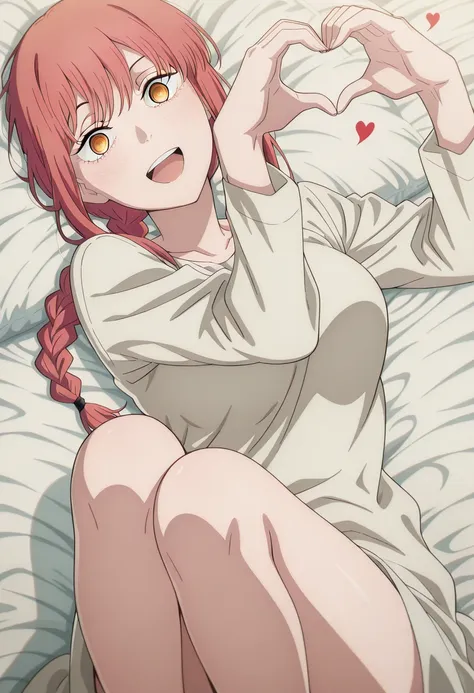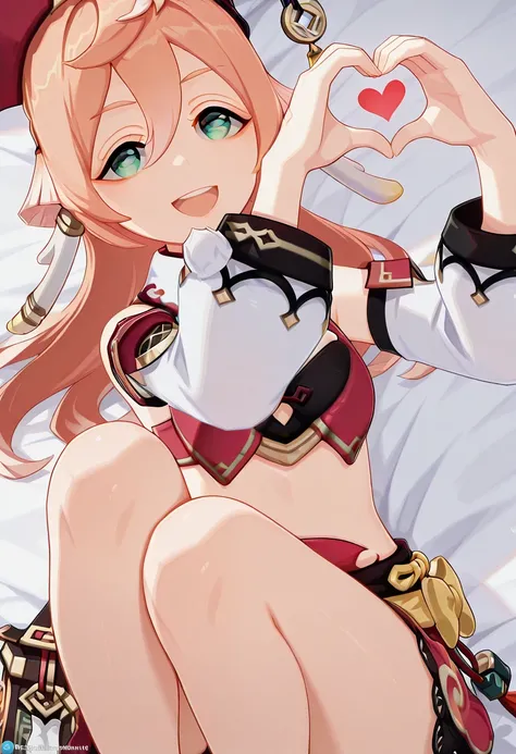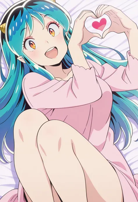 <lora:gotoubunnohanayome-vol5-illustriousxl-lora-nochekaiser:1>, gotoubunnohanayome vol5, solo, looking at viewer, blush, smile, open mouth, sitting, heart, :d, hands up, feet out of frame, upper teeth only, knees up, heart hands, lying, on back,