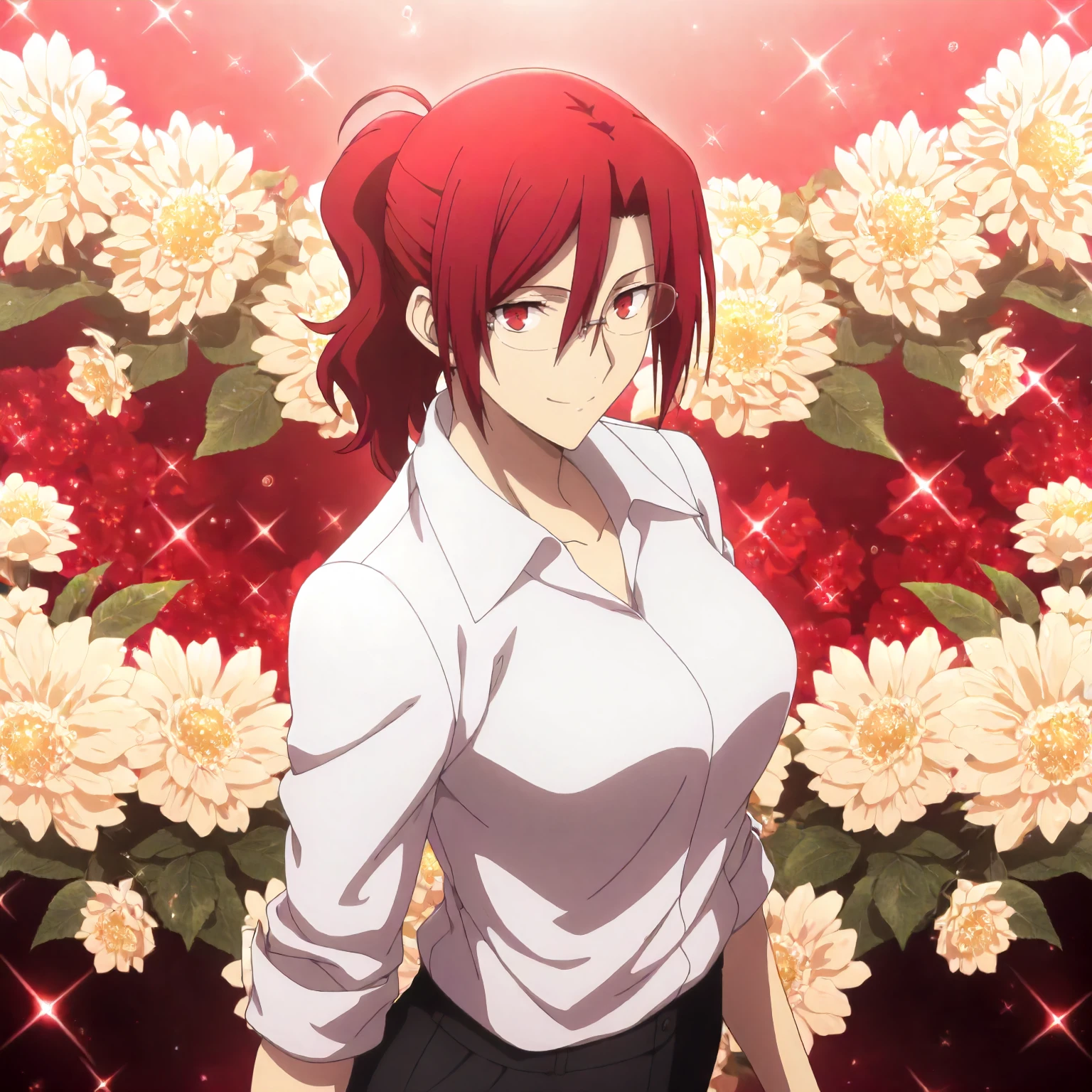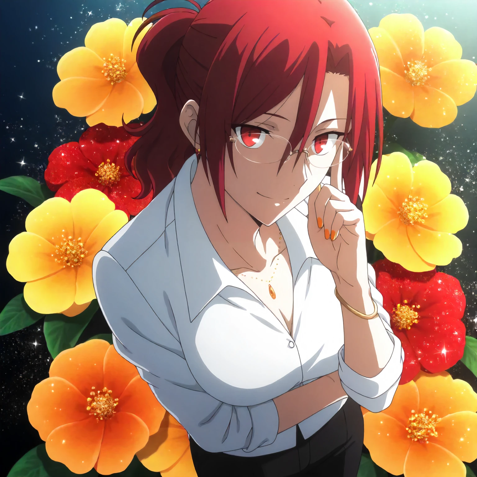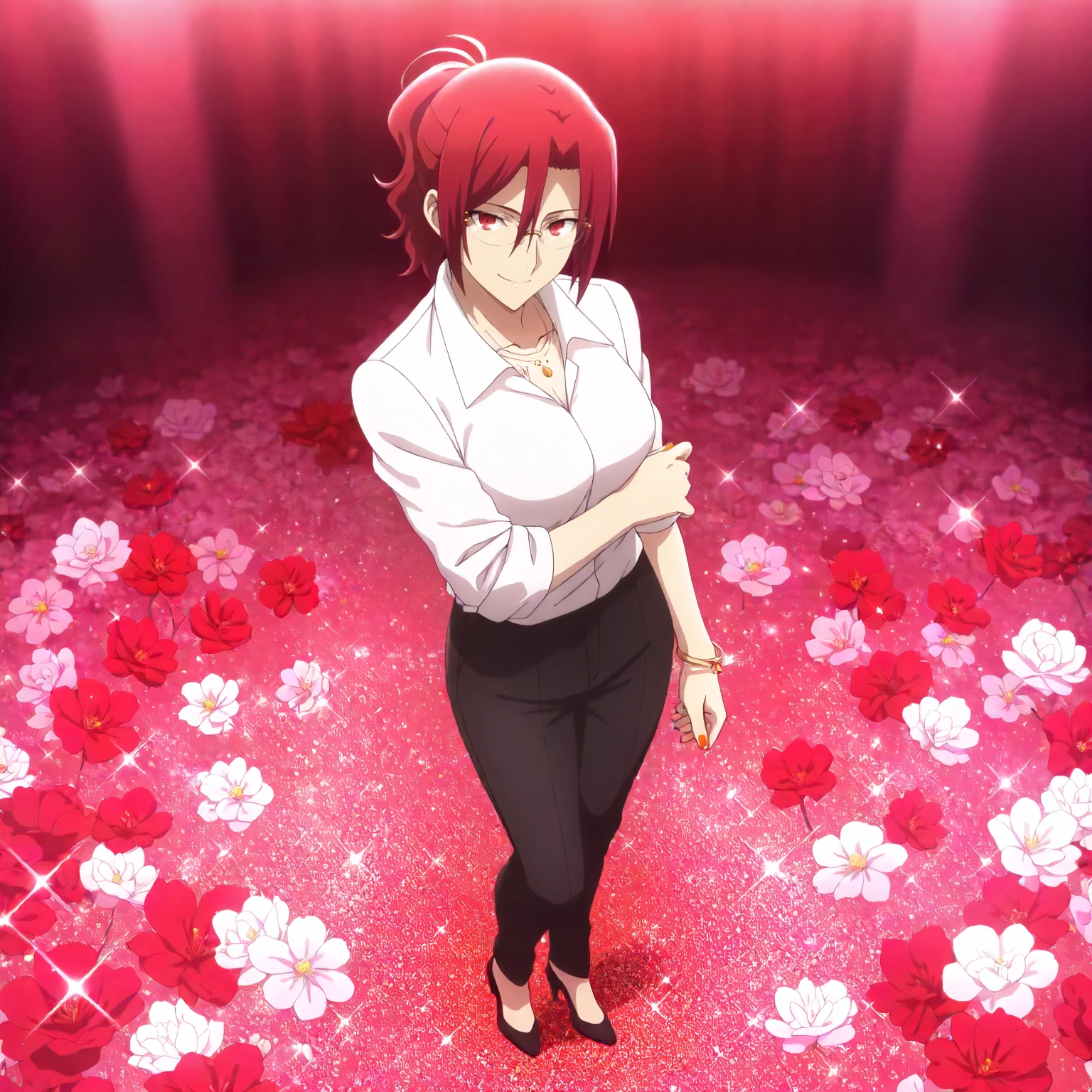 anime coloring, aozaki_touko\(kara_no_kyoukai\),1girl,red hair,ponytail,red eyes,rimless_eyewear,white shirt,collared_shirt,sleeves rolled up, black pants,necklace,bracelet,nail_polish,orange nails,*************************anime coloring, aozaki_touko\(kara_no_kyoukai\),1girl,red hair,updo,hair bun,red eyes,yellow pearl_necklace,black dress,see-through,sleeveless,strap dress,long_dress,black high heels,