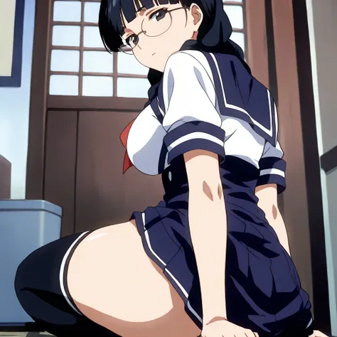 1girl, black hair, twin braids, black eyes, glassesserafuku,underbust,thighhighs