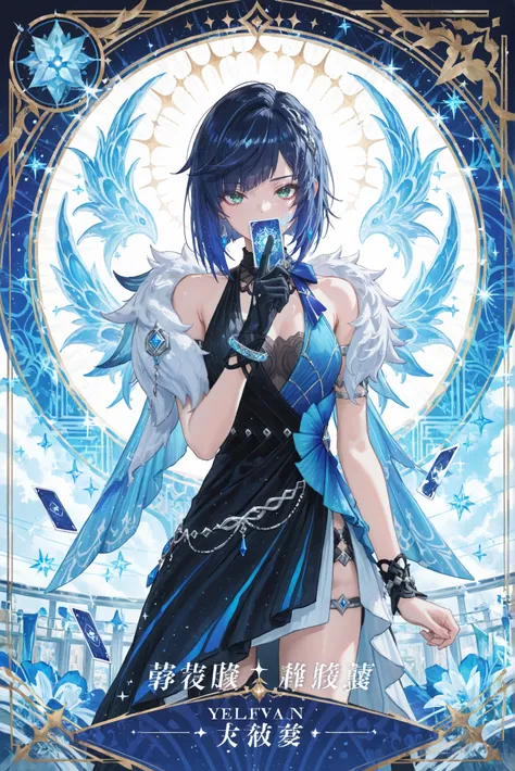 yelan \(genshin impact\), 1girl, blue hair, bangs, green eyes,clothes: yelanew blue-and-black dress, yelanew alternate costume, 1girl, yelanew single glove, jewelry, bracelet, sleeveless,yelanew fur trim,
