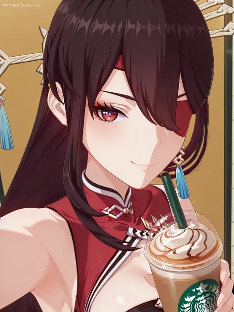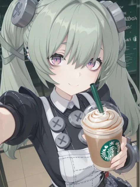 <lora:selfie-holding-starbucks-cup-illustriousxl-lora-nochekaiser:1>, selfie holding starbucks cup, starbucks, solo, looking at viewer, blush, smile, holding, upper body, cup, holding cup, drinking straw, reaching, drink, disposable cup, selfie, reaching towards viewer,
