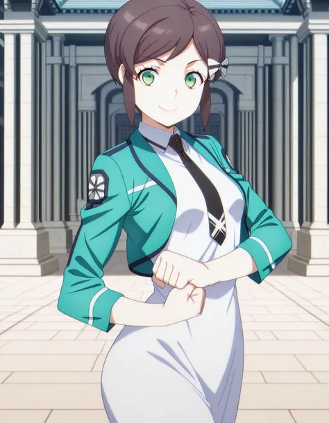 kasumi saegusa, short hair, brown hair, bow, green eyes, hair bow, mature female, small breasts, anime screencapdress, jacket, pantyhose, necktie, white dress, black necktie, green jacket