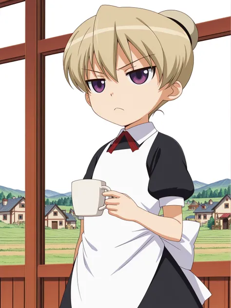 flandre, short hair, blonde hair, purple eyes, hair bun, anime screencapapron, maid,