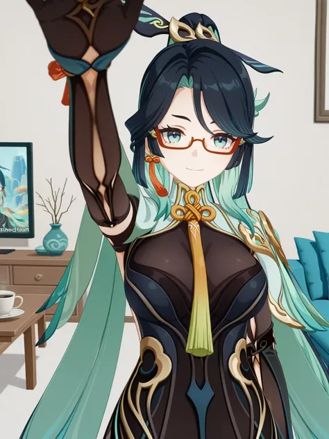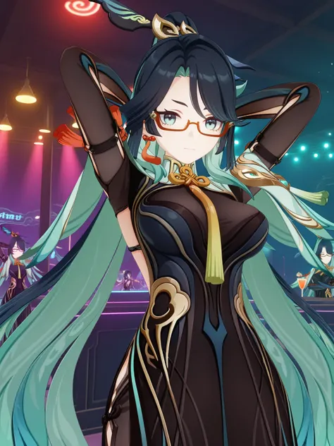 xianyun, xianyun (genshin impact), long hair, black hair, hair ornament, very long hair, blue hair, multicolored hair, green hair, glasses, two-tone hair, aqua eyes, aqua hair, colored inner hair, semi-rimless eyewear, red-framed eyewear, mature female, large breasts, 3dlong sleeves, gloves, dress, jewelry, earrings, black gloves, black dress, tassel, tassel earrings