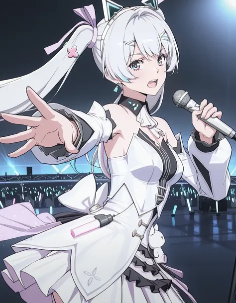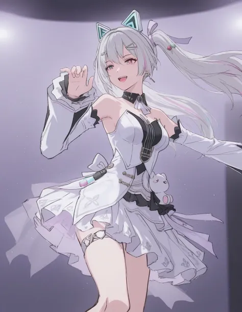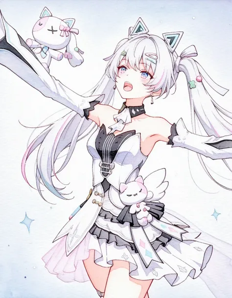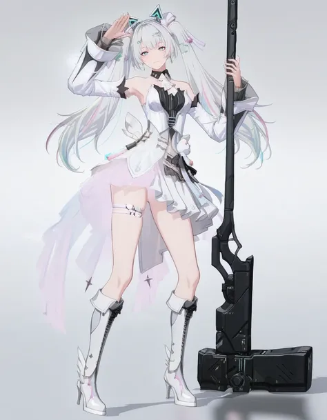 mai_pgr_karenina_blnh,long_hair,twintails,grey_hair,multicolored_hair,multicolored_eyes,hair_ornament,hairclip,fake_animal_earsidol_clothes,detached_sleeves,detached_collar,white_dress,white_skirt,frilled_dress,thigh_strap,knee_boots,high_heels,white_footwear,stuffed_toyhuge_weapon,war_hammer