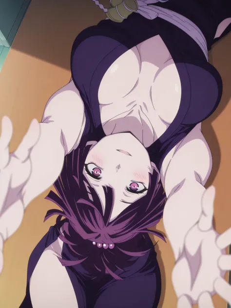 <lora:upside-down-reaching-towards-viewer-illustriousxl-lora-nochekaiser:1>, upside-down reaching towards viewer, solo, looking at viewer, blush, smile, open mouth, parted lips, lying, on back, blurry, depth of field, outstretched arms, blurry foreground, reaching, reaching towards viewer, upside-down,