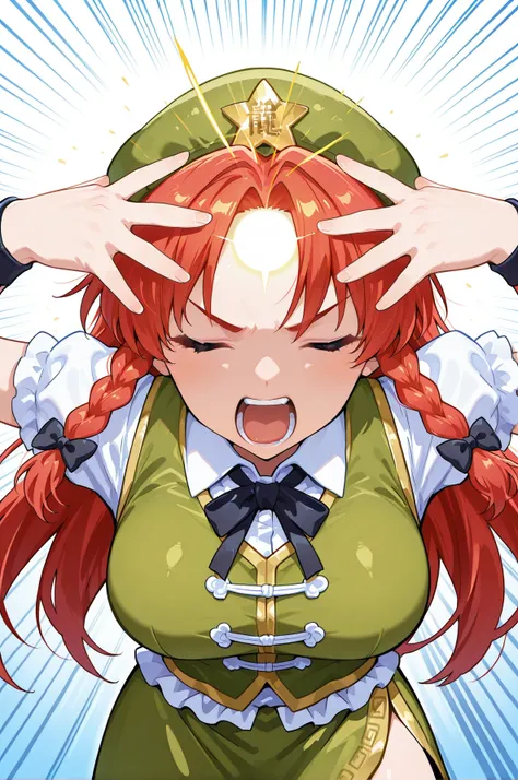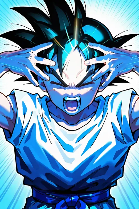 taiyouken(tenshinhan), taiyouken, hand gesture, posing, hands up, hands near face, spread fingers,taiyouken(krillin),two-finger salute, taiyouken, hand gesture, posing, hands up, hands near face,blue_theme, glowing, (monochrome:1.2), emphasis lines, closed_eyes, shouting, overexposure