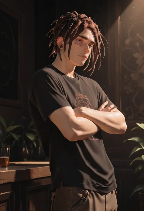 LIS2Finn, 1boy, male focus, dreadlocks, short hair, brown hair, blue eyes, facial mark, hair ornament