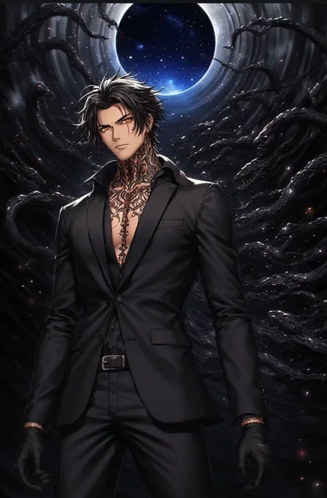 voxlong hair,looking at viewer,smile,open mouth,bangs,shirt,black hair,hair ornament,1boy,jewelry,jacket,yellow eyes,male focus,red hair,multicolored hair,earrings,teeth,choker,hairclip,collared shirt,medium hair,kimono,nail polish,hair over one eye,bracelet,streaked hair,dress shirt,makeup,buttons,fangs,floral print,white jacket,red shirt,tassel,black nails,eyeshadow,beads,single earring,red choker,bead bracelet,tassel earrings,red eyeshadow