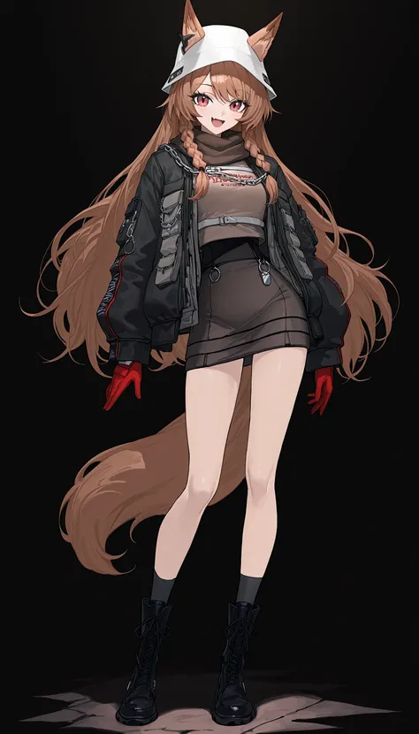 ceobe_\(arknights\) , red eyes, brown hair ,dog ears, dog tail, jacket , short dress , belt , pouch , oripathy lesion (arknights) , infection monitor (arknights) , cross-laced , thigh boots , weapon on back ,ceobe_\(unfettered\) , red eyes, brown hair , dog ears, dog tail, twin braids , ears through headwear , hat , black jacket , open_jacket , brown shirt, brown scarf, red gloves , chain , high_belt , pencil_skirt , black socks , lace-up boots,ceobe_\(summer_flowers\) , red eyes, brown hair , dog ears,dog tail, black choker , padlock , orange jacket ,crop top, arm strap ,thigh strap ,black shorts , midriff, bare shoulders ,off shoulder, infection monitor (arknights) , single_pantsleg, torn pants, white shoes,