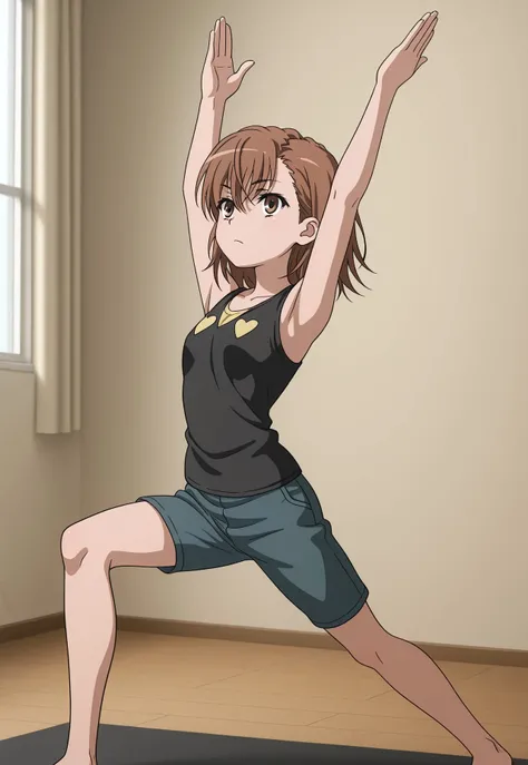 Misaka mikotocasual clothesbaseball cap,alternate hairstyle,short hair,short ponytail,brown hair,hair between eyes,bangs,brown eyescollarbone,bra strap,t-shirt,black shirt,heart print,electricity,electrokinesis,green shorts,short shorts,sneakers