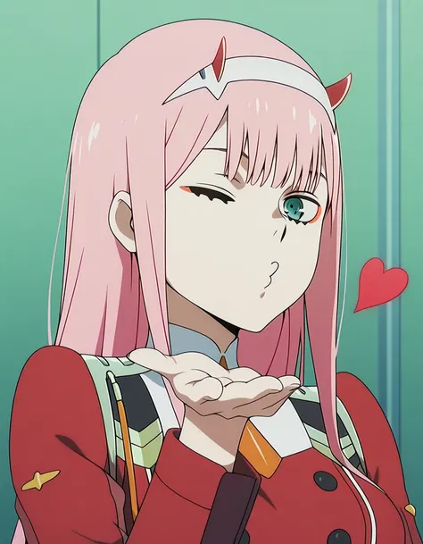 zero two, zero two (darling in the franxx), green eyes, hairband, horns, long hair, pink hair, red horns, white hairband, mature female, medium breasts, anime screencap,jacket, leggings, red jacket, white footwear,bodysuit, covered navel, pilot suit, red bodysuit, science fiction,