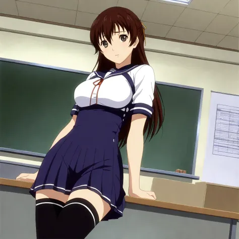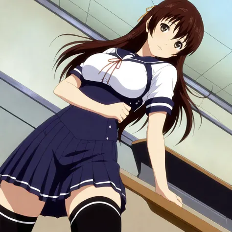 amiuehara, brown hair, long hair, hair ribbon, brown eyesserafuku,underbust,thighhighs