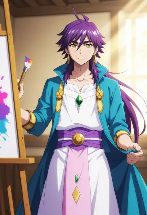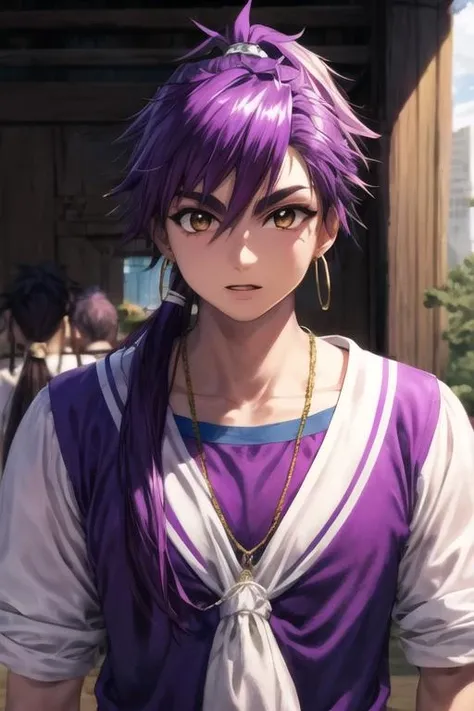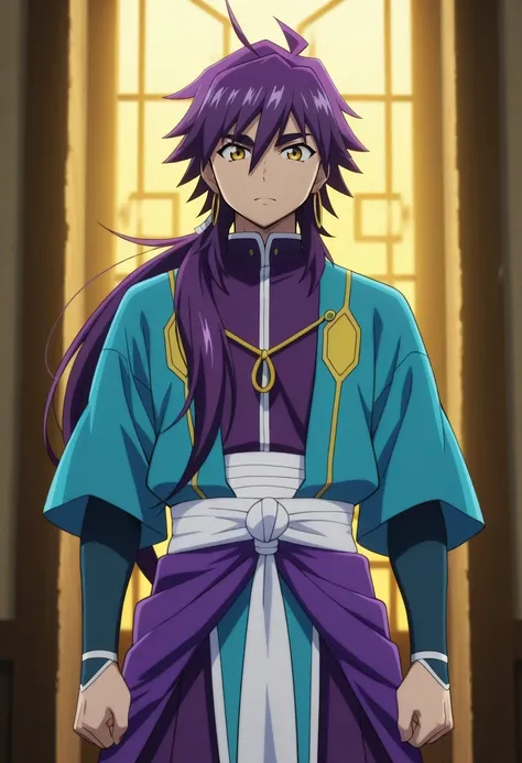 snbd_msnb, purple hair, yellow eyes, long hair, ponytail, hair between eyes, ahoge, thick eyebrowsaged downwhite wrap top, blue and gold patterned bustier, white bandages, gold hoop earrings, white obiblue open coat, white tunic, light pink panel, green gem, gold trim, gold hoop earrings, gold buttons