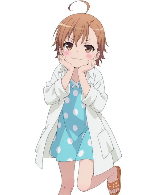 last order, last order (toaru majutsu no index), short hair, brown hair, brown eyes, ahoge, blush, blush stickers, anime screencapdress, blue dress, sandals, polka dot, labcoat, polka dot dress,