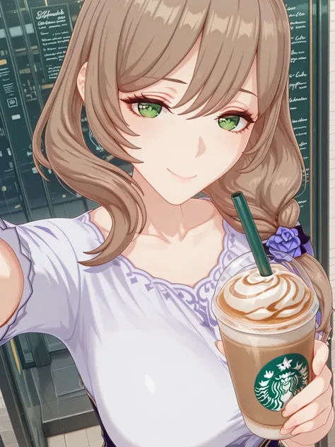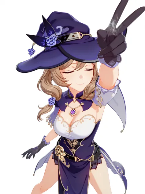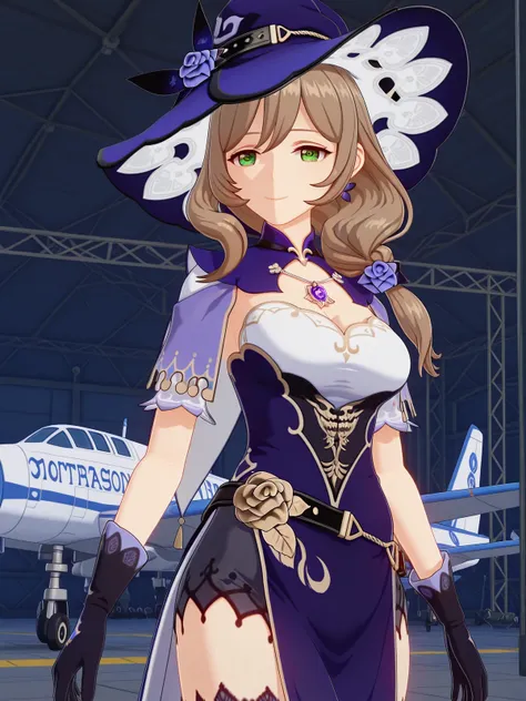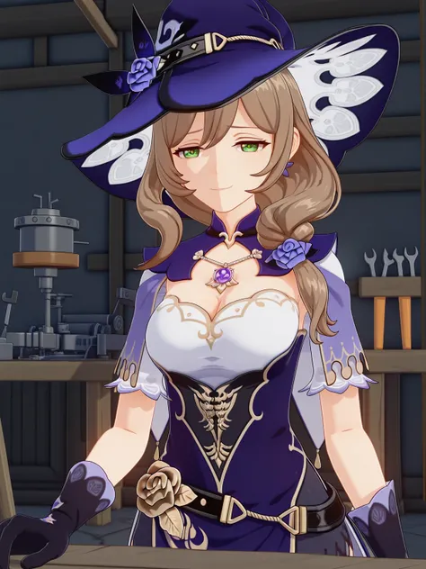 lisa minci, lisa (genshin impact), brown hair, green eyes, long hair, low tied hair, mature female, breasts, 3dbelt, capelet, cleavage, gloves, hat, hat belt, jewelry, necklace, pendant, purple capelet, purple headwear, vision (genshin impact), witch, witch hat