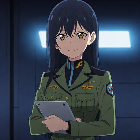 Comoli_Harcourt, brown and blue eyes, black hair, mole under eye, mole, short hair, uniform, military uniform, green jacket