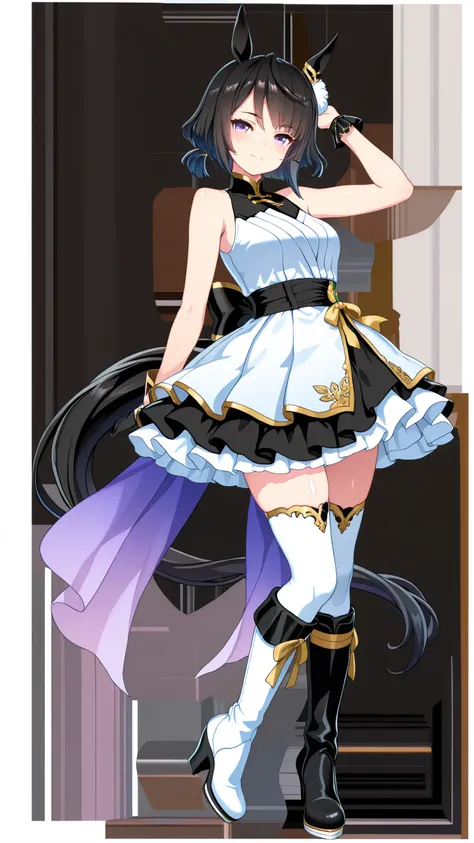 umaofficialumachar,shobufukuumachar,tracen school uniform,purple sailor shirt,white pleated skirt,purple bow,puffy short sleeves,white thighhighs,brown loafers,horseshoe ornamentumachar,starting future,white cropped jacket,deep red shorts,purple choker,garter straps,purple thighhighs,white high heel boots,purple wristband