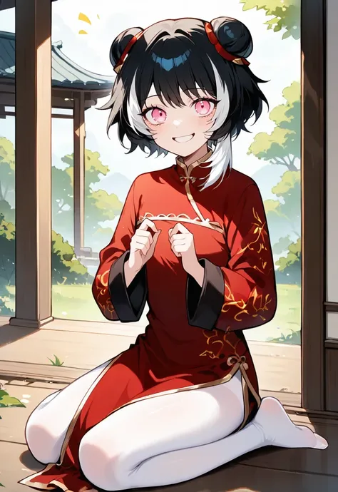 JiaXichunLimbusJiaXichunBase, long hair, four long braids, multicolored hair, black hair, white hair, double bun, red hair ornament, pink eyes, china dress, red sleeves, wide sleeves, gold trim, slit left side, black footwear, asymmetrical footwearJiaXichunHierarch, long hair, multicolored hair, black hair, white hair, multiple hair bun, long sade braids, red hair ornament with gold trim, pink eyes, red coat, black fur trim, china dress, red sleeves, wide sleeves, gold trim, slit left side, black footwear, asymmetrical footwearJiaXichunChild, female child, multicolored hair, black hair, white hair, short hair, double hair bun, red hair ornament, pink eyes, red cheongsam, white pantyhose