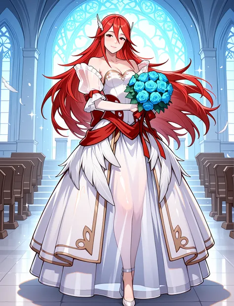 AwaBride, collarbone, strapless, bare shoulders, cleavage, back bow, ribbons, butterfly hair ornament, long dress, glowing dress, sparkling dress, shiny clothes, sash, white wedding dress, feather trim, detached sleeves, bridal gauntlets, gold trim, hobble dress, wedding ring,