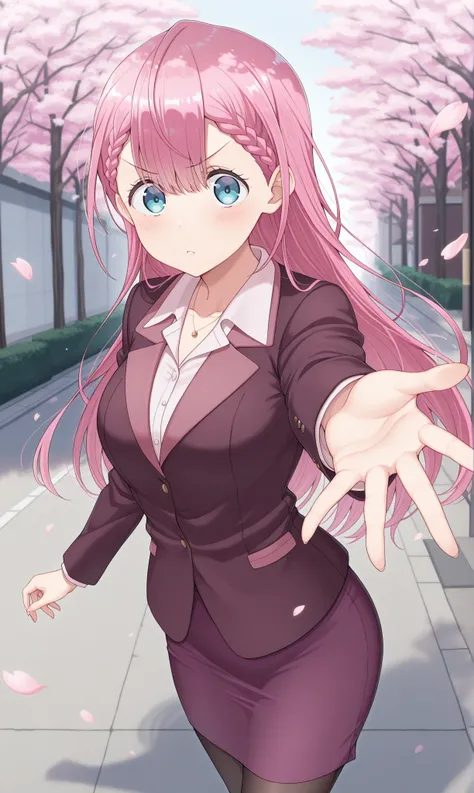 kirisu mafuyu, very long hair, pink hair, braid, blue eyesshirt, collared shirt, jacket, suit jacket, long sleeves, purple skirt, pencil skirt, necklace, jewelry, pantyhose