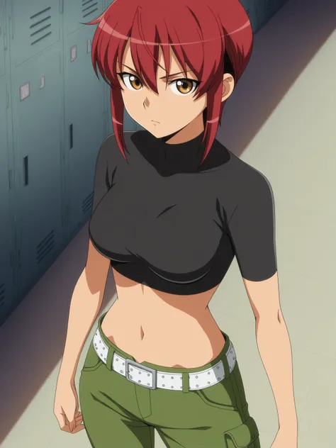riza wildman, short hair, brown eyes, red hair, hair between eyes, sidelocks, mature female, medium breasts, anime screencapshirt, short sleeves, midriff, belt, pants, crop top, cropped shirt, green pants, black shirt, turtleneck,