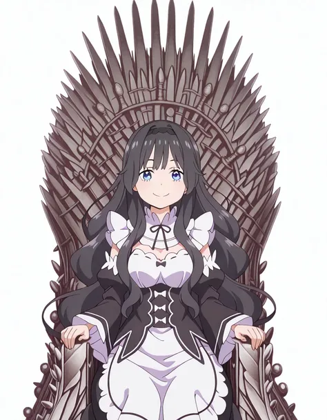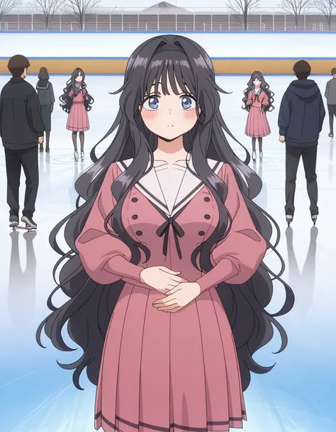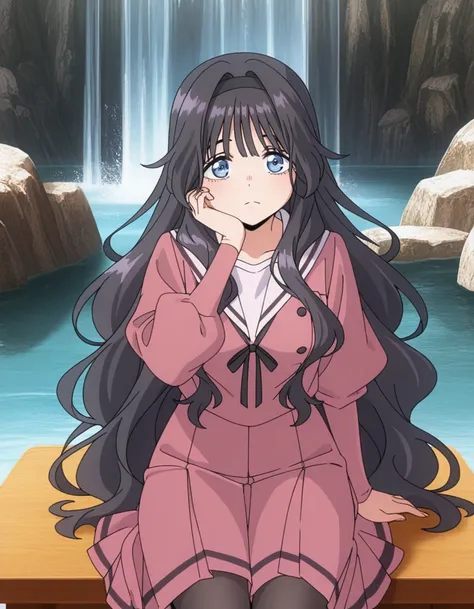 kaoruko waguri, long hair, blue eyes, black hair, very long hair, sidelocks, hairband, wavy hair, hair intakes, black hairband, mature female, medium breasts, anime screencapshirt, skirt, long sleeves, ribbon, pantyhose, pleated skirt, serafuku, puffy sleeves, sailor collar, black pantyhose, neck ribbon, black ribbon, pink skirt, white sailor collar, pink shirt,