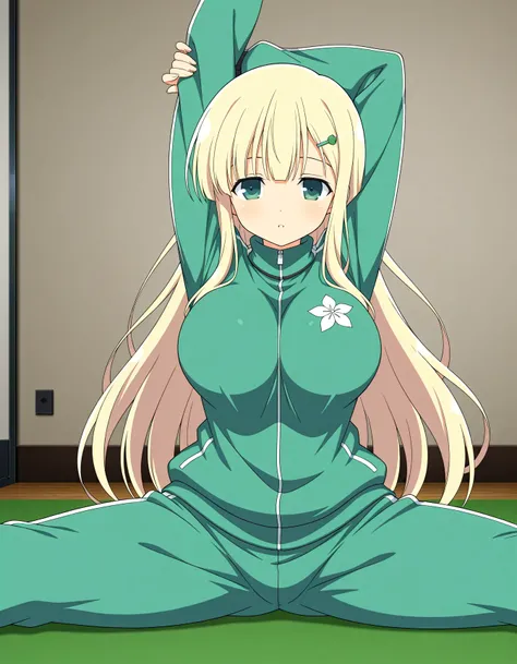 yomi \(senran kagura\),green eyes,blonde hair,long hair,green hairclip,large breasts,green headwear,hat bow,white ribbon,detached collar,green dress,strapless,detached sleeves,white gloves,frills,apron,pouch,leather belt,frilled skirt,black sailor collar,school uniform,black tie,black serafuku,black shirt,black skirt,pleated skirt,crop top,short sleeves,green track suit,green track jacket,green track pants,track shoes,