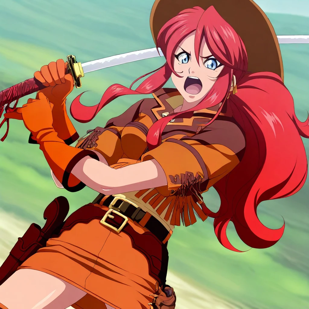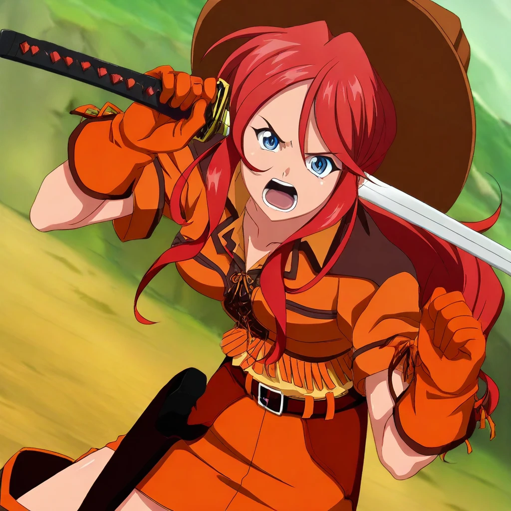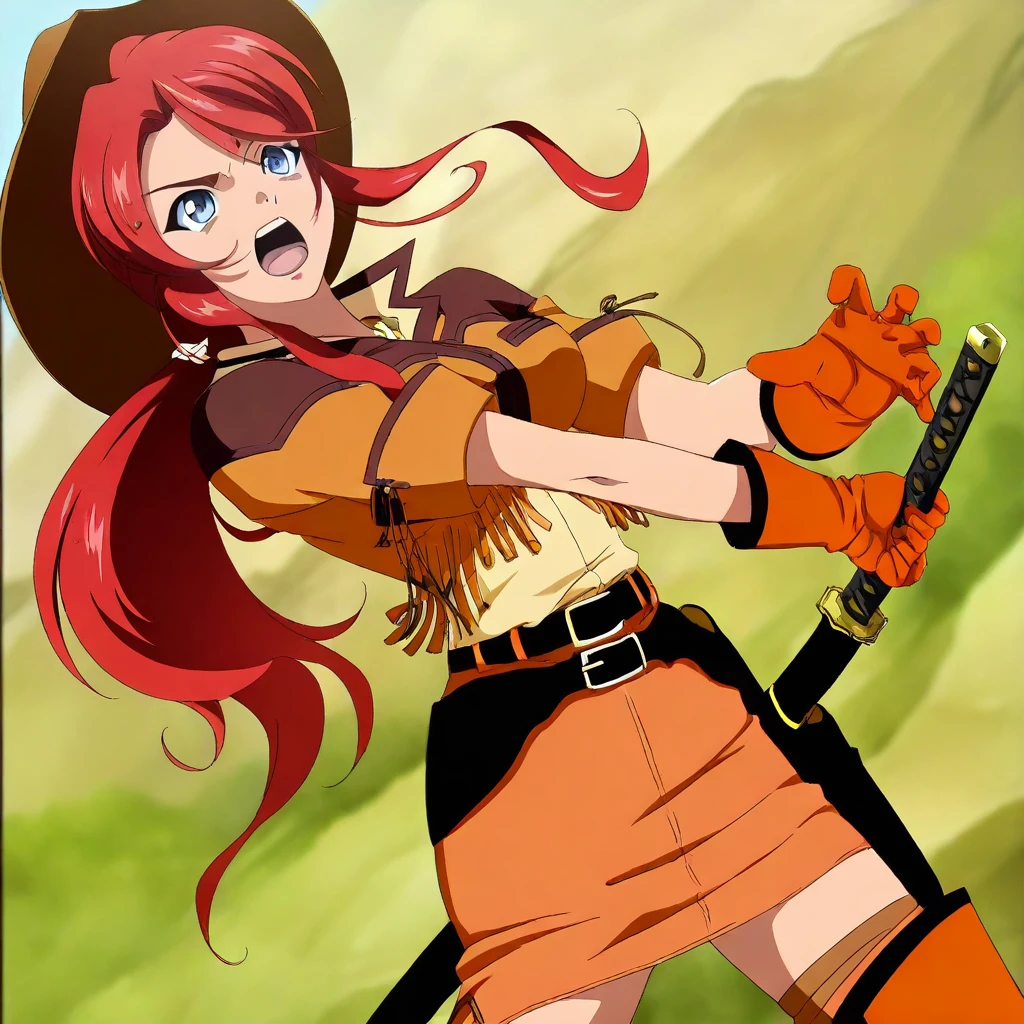 SWNY_Gemini_ILred hair, long hair, ponytail, parted bangs, sidelocks, blue eyes, breasts,SWNY_Gemini_Casual, white head-scarf, white jacket, tied jacket, midriff, orange shoulder-accents, orange pants,SWNY_Gemini_Cowgirl, brown cowboy hat, yellow collared shirt, orange jacket, fringe-trim, brown shoulder-accents, short-sleeves, orange gloves, orange skirt, belt, belt buckle, holster, orange cowboy boots,SWNY_Gemini_NYCR, white/orange uniform, long-coat, black trim, white elbow-gloves, gold buttons, black pants, white thigh-boots,katana