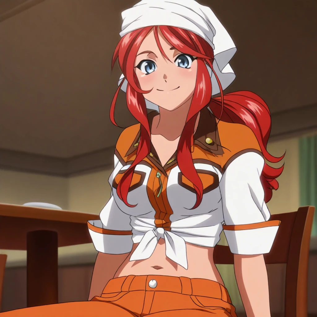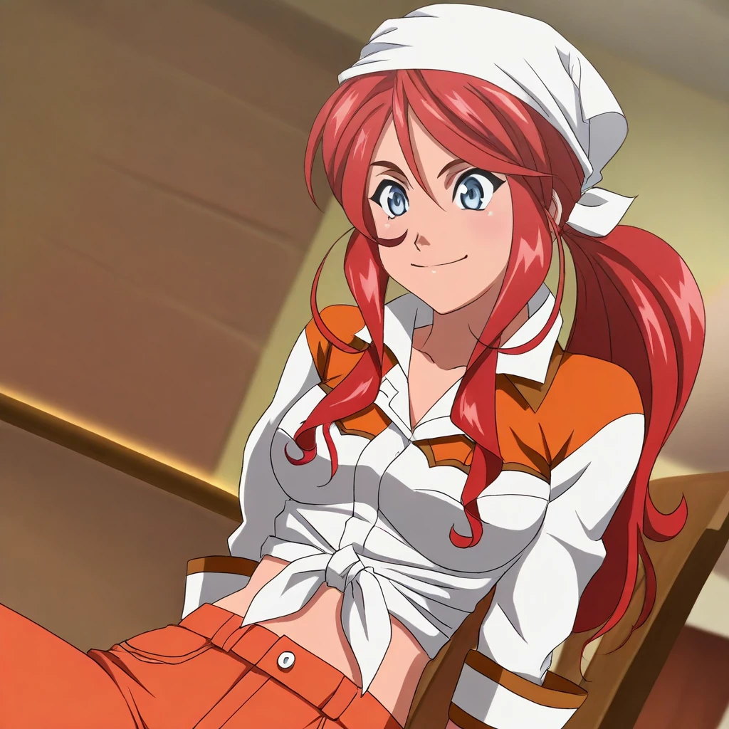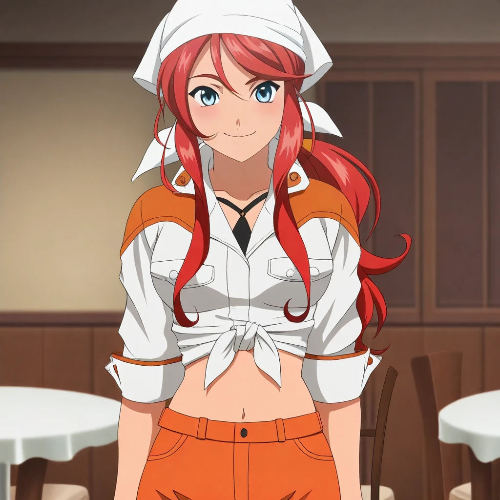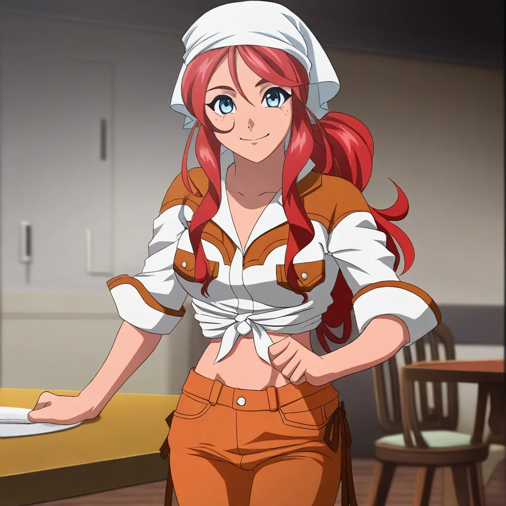 SWNY_Gemini_ILred hair, long hair, ponytail, parted bangs, sidelocks, blue eyes, breasts,SWNY_Gemini_Casual, white head-scarf, white jacket, tied jacket, midriff, orange shoulder-accents, orange pants,SWNY_Gemini_Cowgirl, brown cowboy hat, yellow collared shirt, orange jacket, fringe-trim, brown shoulder-accents, short-sleeves, orange gloves, orange skirt, belt, belt buckle, holster, orange cowboy boots,SWNY_Gemini_NYCR, white/orange uniform, long-coat, black trim, white elbow-gloves, gold buttons, black pants, white thigh-boots,katana