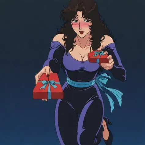 rui kisugi \(cat's eye\), dark brown hair, long hair, brown eyes, red lipstick, purple bodysuit, sash, heels, cleavage, large breasts, 1girl, solo
