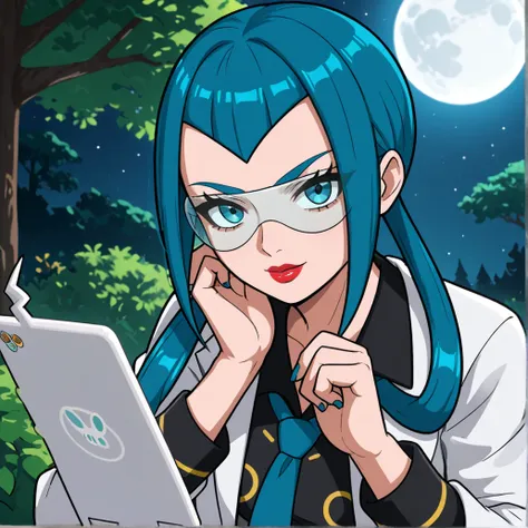 zamable, mable \(pokemon\), blue hair, bangs, hair rings, blue eyes, red lips, blue nails, safety glasses, collarbone, collared dress, black dress, blue necktie, labcoat, long sleeves, black pantyhose, black belt, shoes, two-tone shoes, grey footwear, white footwear, high heelstablet pc