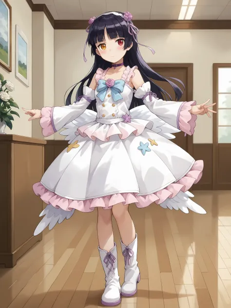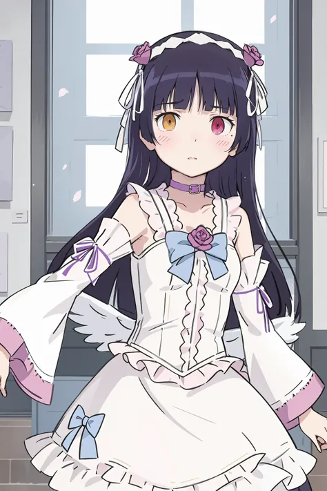 gokou rurired eyes, black flower hairband, frilled ascot, flower brooch, black cropped jacket, white frilled shirt, black hoop skirt, petticoat, grey pantyhose, mary janesyellow neck ribbon, white collared shirt, yellow sweater vest, blue miniskirt, black kneehighs, loafersheterochromia, white flower hairband, purple choker, white frilled sleeveless dress, low wings, white detached sleeves, white knee bootsred eyes, cat ears, red neck ribbon, black maid dress, maid apron, black thighhighs, mary janes