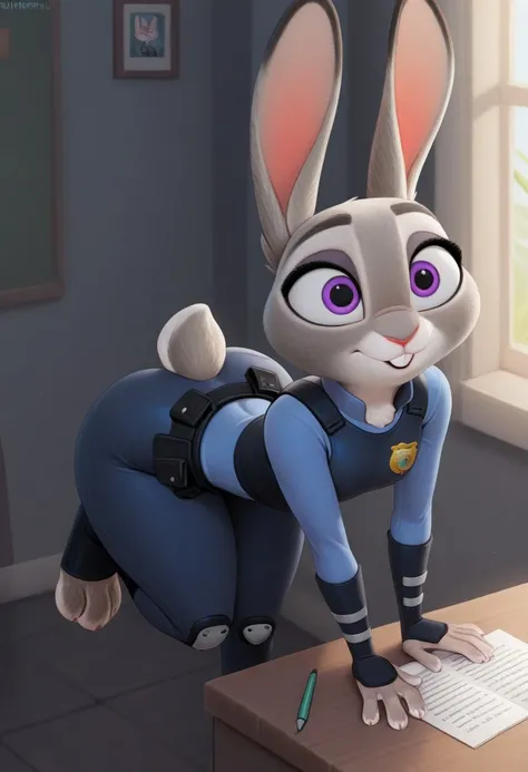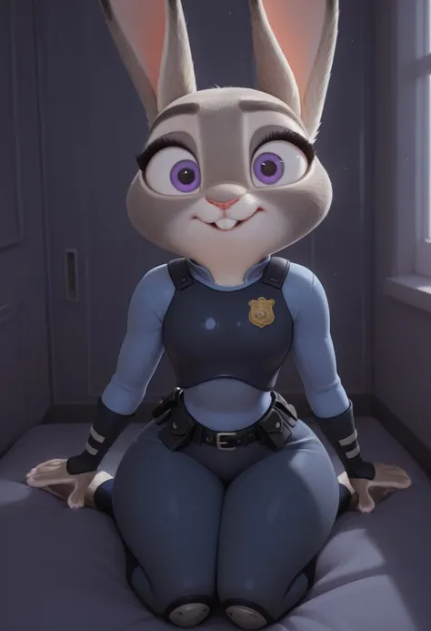 rabbit girl, judyhoppsILL, rabbit ears, purple eyes, grey fur, blue police uniform, toeless legwear, vest, blue pants, buckteeth,zootopia, judy hopps