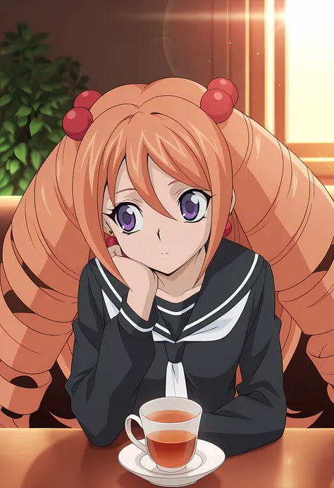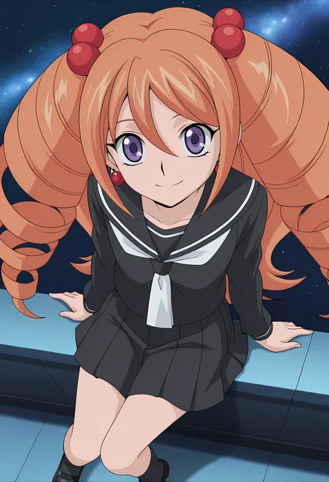 Rekka Tatsunagi (Cardfight Vanguard), long hair, orange hair, drill hair, twin drills, purple eyes, earrings, jewelry, hair ornament, hair bobbles, school uniform, black serafuku, black skirt, pleated skirt, white neckerchief, long sleeves, pleated skirt, black footwear, mary janes,