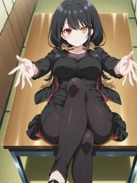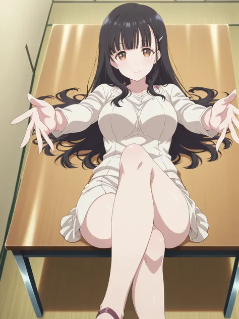 <lora:crossed-legs-reaching-towards-viewer-illustriousxl-lora-nochekaiser:1>, crossed legs reaching towards viewer, solo, looking at viewer, blush, smile, closed mouth, sitting, lying, indoors, on back, crossed legs, outstretched arms, on table, on desk,