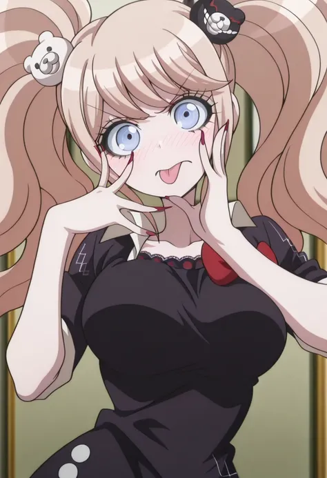 <lora:gotoubunnohanayome-vol6-illustriousxl-lora-nochekaiser:1>, gotoubunnohanayome vol6, solo, looking at viewer, blush, closed mouth, tongue, tongue out, hands up, v-shaped eyebrows, akanbe,